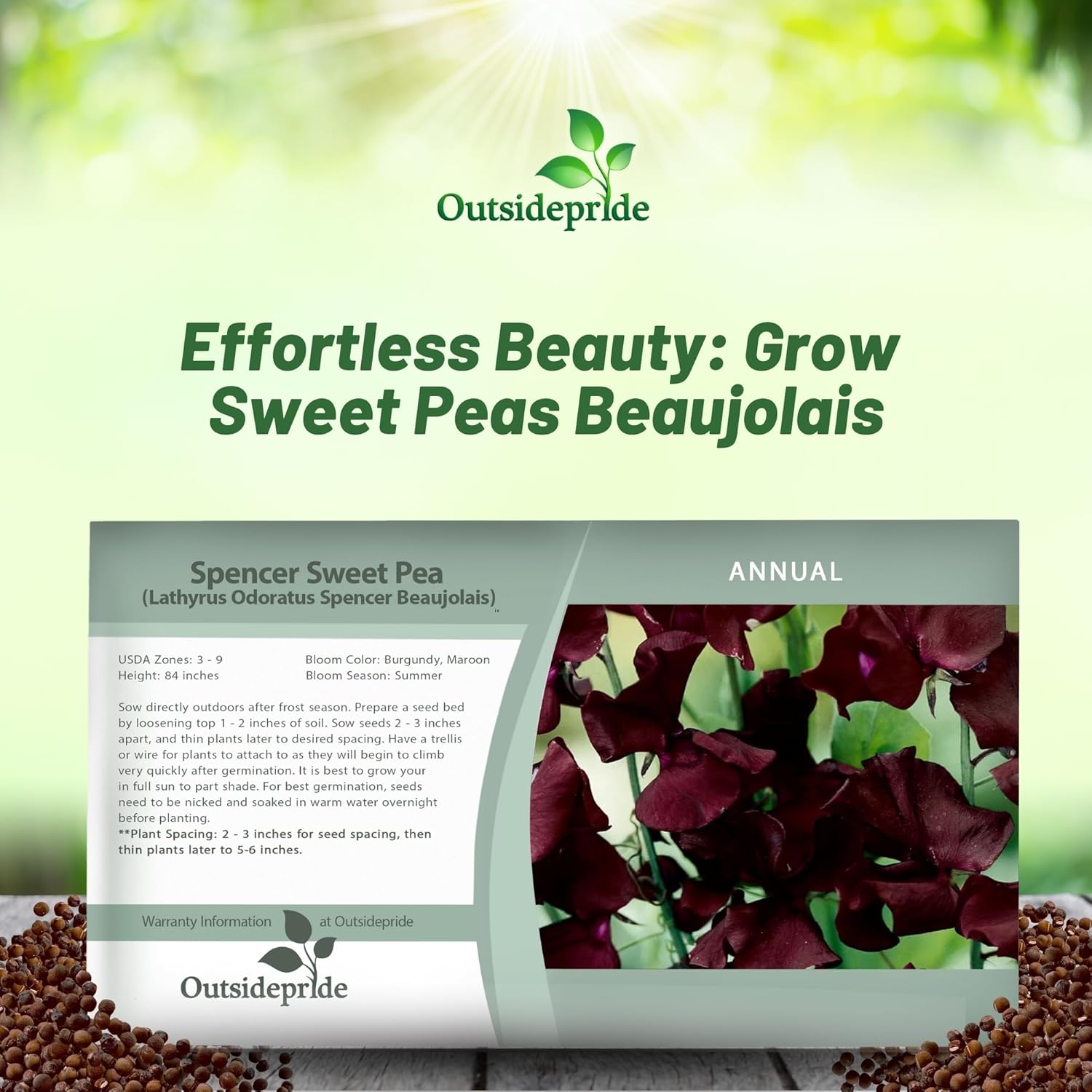 Spencer Sweet Pea (Lathyrus Odoratus Spencer Beaujolais) - Fragrant brilliant deep-burgundy flowers. Spencer-type blooms are large, held on long, strong stems. This sweet pea variety makes an outstanding cut flower and from the 7 foot tall vines which are heavy blooming you have plenty of flower to choose from.MORE SWEET PEAS OPTIONS